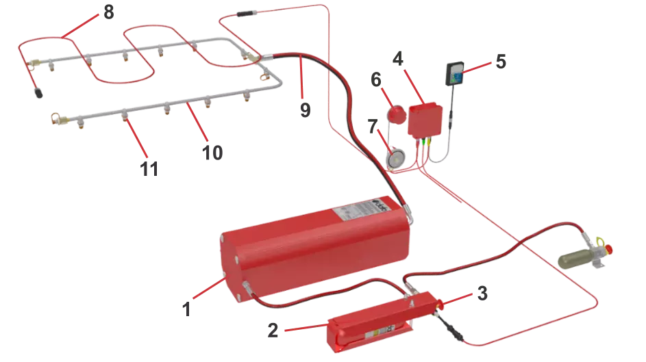 El cable del detector (8) detecta el fuego y envía una señal eléctrica la unidad de control (4) para que el actuador (3), perfore el nitrógeno (2). El cilindro de nitrógeno presuriza al tanque de Forrex (1), liberando el agente a una presión aproximada de 21 bar, distribuyéndolo a través de las mangueras (9), tuberías (10)y boquillas difusoras (11). Al mismo tiempo que se activa el sistema, se activan las sirenas de alarma visual (6) y acústica (7). Estas alarmas se indican en el panel de alarma (5) ubicado en la cabina del operador. Además, el sistema también puede contar con activadores manuales adicionales en la unidad.
