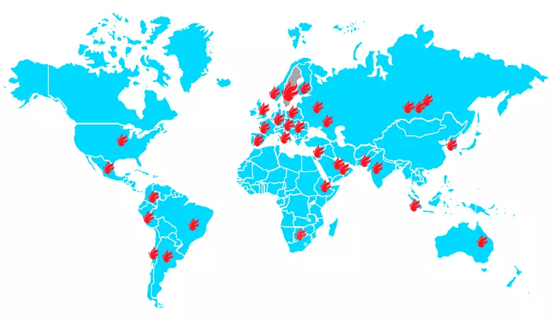 Nuestros sistemas de extinción de incendios son utilizados e instalados por muchas de las principales fábricas productoras de vehículos en todo el mundo como ser Volvo, Atlas Corpo, John Deere, Scania, Kalmar, Komatsu entre otras y que abastecen de los mismos a los sectores Mineros, Industriales, Forestales, Portuarios, etc. en los 4 Continentes.